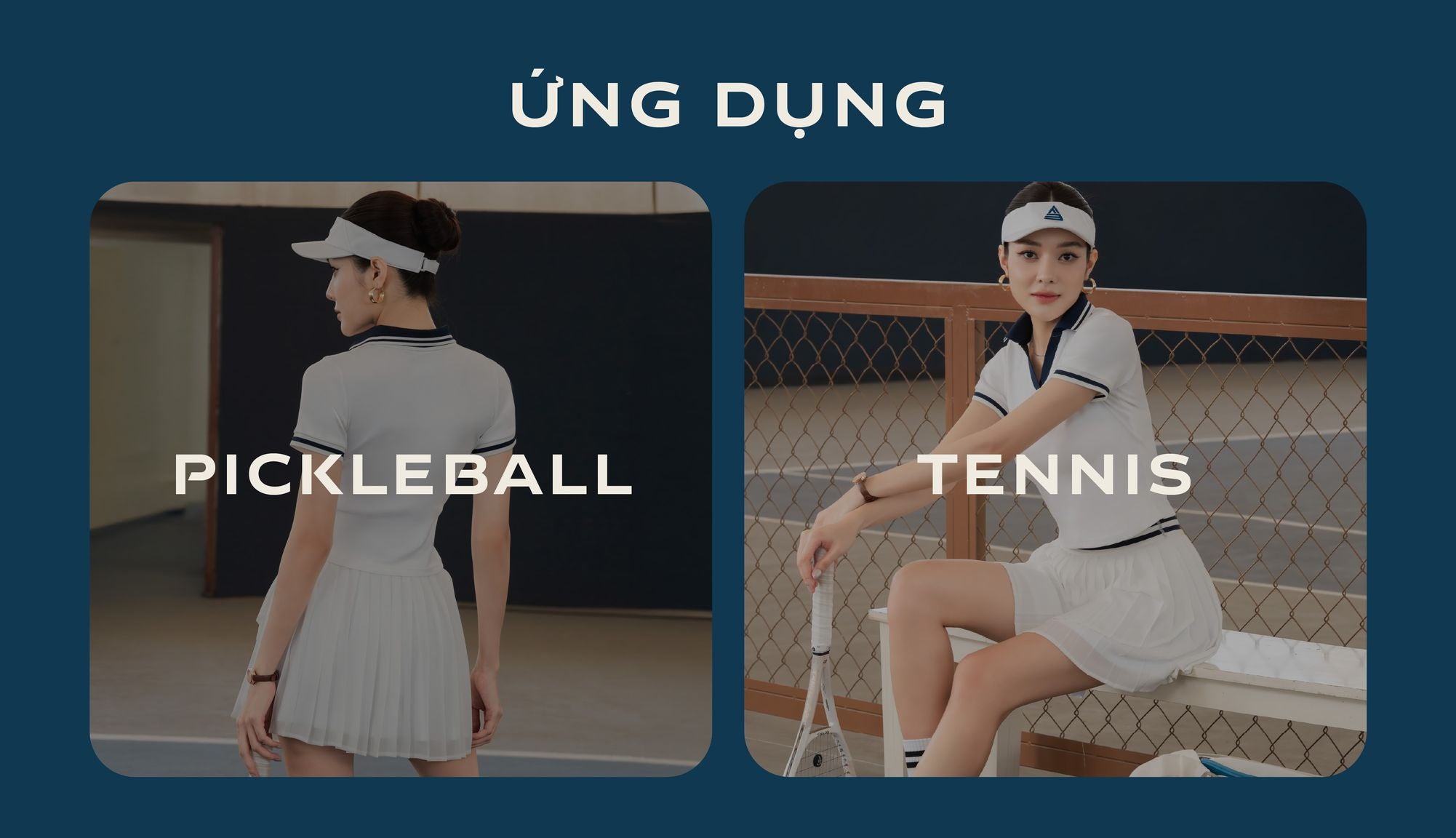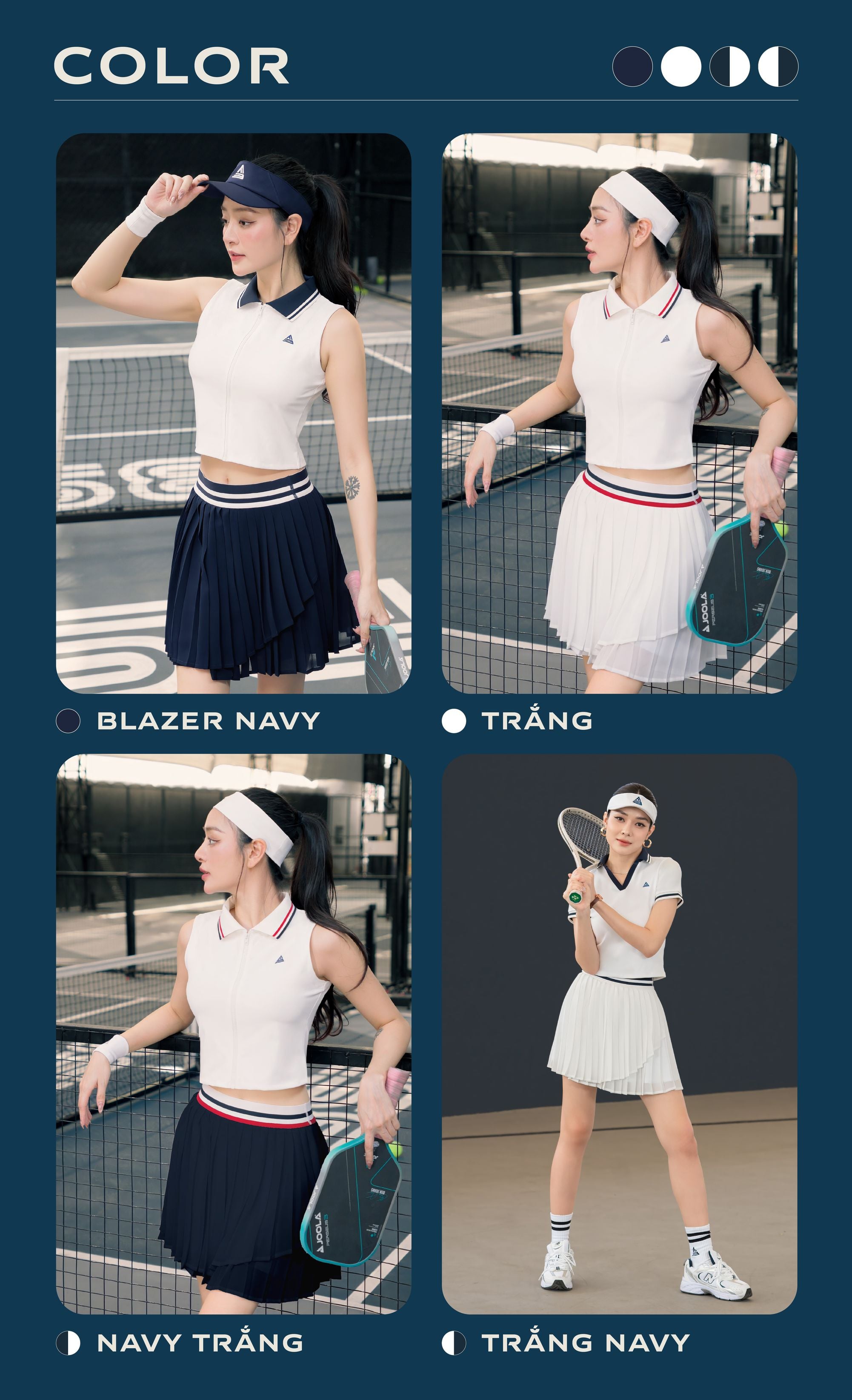 - Chân váy dáng xòe nhẹ, vừa vặn với cơ thể, giúp tôn lên dáng vẻ khỏe khoắn nhưng không kém phần duyên dáng. Thiết kế này phù hợp với nhiều môn thể thao như tennis, cầu lông, pickleball,...