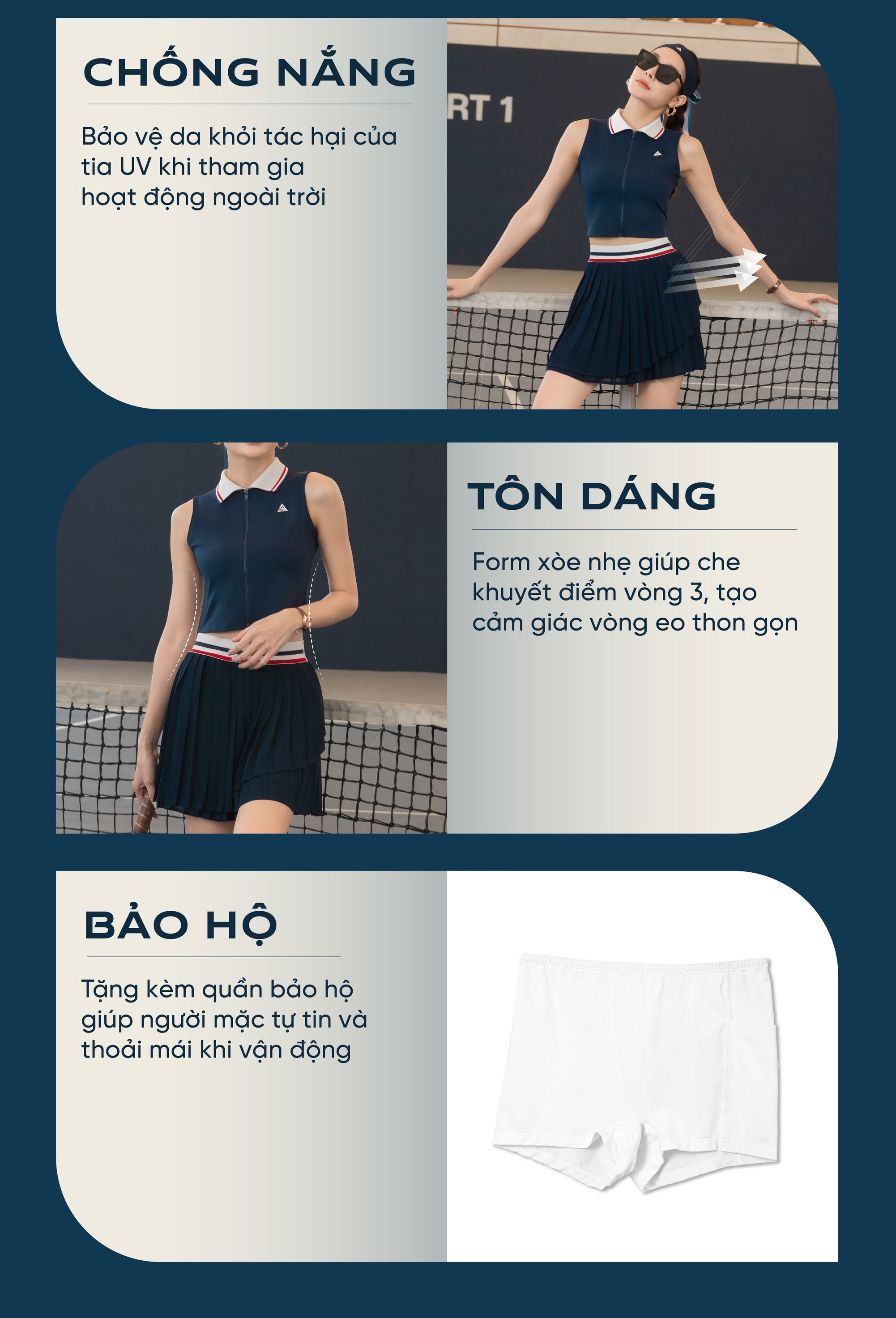 - Được thiết kế với các đường xếp ly tinh tế ba lớp, tạo nên sự mềm mại, thanh thoát cho người mặc, phù hợp hoạt động thể thao và ngoài trời, vừa năng động, vừa nữ tính